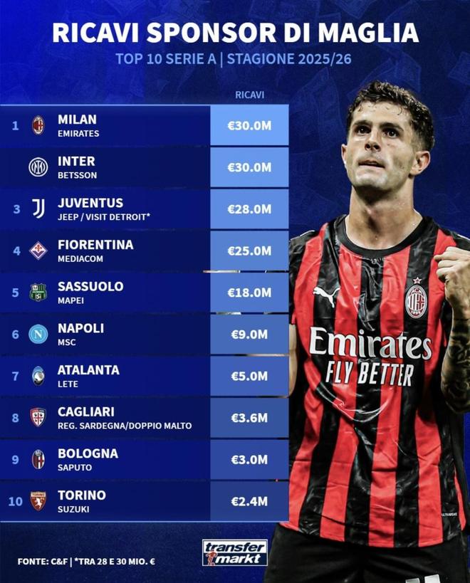 另一点是联赛层面的“集体缺位”。欧洲赞助收入前十里,英超占了四个席位,西甲、德甲、法甲也都有代表,唯独没有意甲俱乐部。哪怕AC米兰、国际米兰这几年战绩和话题度都有回暖,在商业开发上依然追不上同级别的英超和西甲豪门。整体来看,目前球衣主赞助的盘子更多是被英超和少数几家超级豪门吃走,意甲只能在内部做分配,很难真正分享那一层级的商业红利。